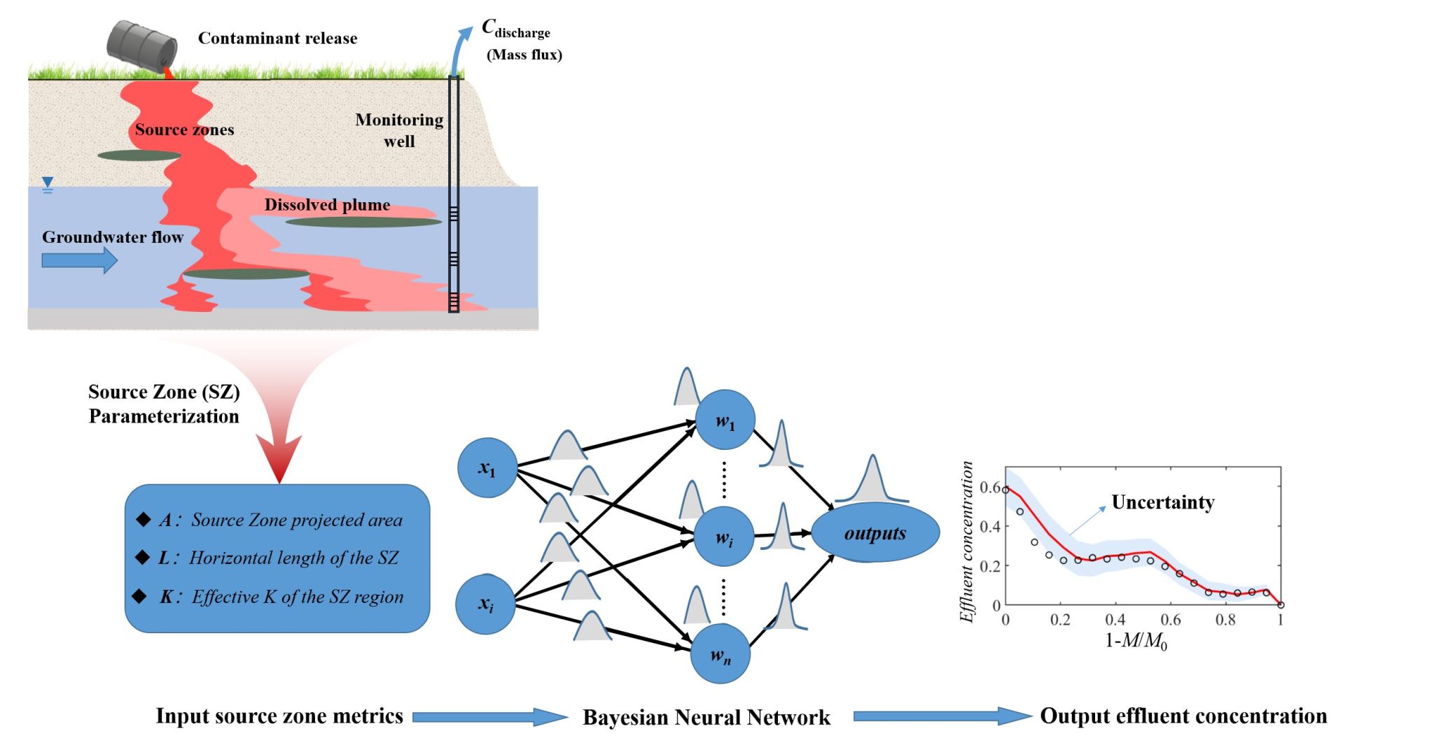 Recently, the research group of Prof. Jichun Wu and Prof. Xiaoqing Shi proposed a new method based on explainable neural networks to explore the mass-transfer mechanisms of organic contaminant source-plume in groundwater and developed an accurate model for contaminant mass flux prediction. To represent the highly nonlinear relationship between source zones and dissolved plumes, they built a Bayesian Neural Network (BNN) framework to learn this “source-plume” relationship from a data-driven perspective. Then, the interpretive machine learning method (Expected Gradients) was utilized to reveal the physical causes and the main controlling factors of the multistage nonlinear dissolution behavior of organic contaminant source zones. The results show that: the peak value of the mass flux in the early stage of source depletion is mainly controlled by the vertical distribution of low-saturation source zones, while the tail value of the mass flux in the late stage is controlled by both the lateral length and mean permeability of high-saturation source zones. Based on these findings, a deep learning-based upscaled model for contaminant mass flux prediction was developed. With only a small number of source-zone spatial metrics, the multi-stage nonlinear dissolution process can be accurately reproduced, which can provide strong technical support for the management and risk assessment of the contaminated sites.