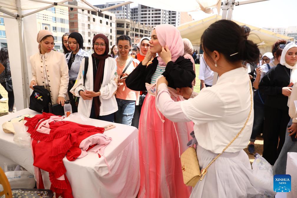 An Egyptian student tries traditional Chinese costumes during a ceremony to celebrate Chinese Language Day in Cairo, Egypt, April 27, 2024. Students studying in Egyptian colleges celebrated Saturday the United Nations Chinese Language Day with a themed event featuring a concert, food and tea tasting, sketch comedy, and art show. (Xinhua News Agency/Ahmed Gomaa)
