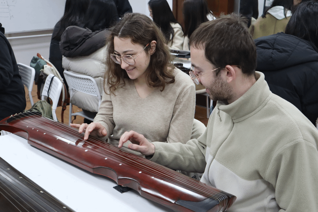 Teacher Zhou Qian first introduced the history of the Guqin, allowing the students to experience its unique sounds up close. During the session on notation and rhythm, the teachers explained how to read the simplified notation and showed the differences between duple and triple meters.