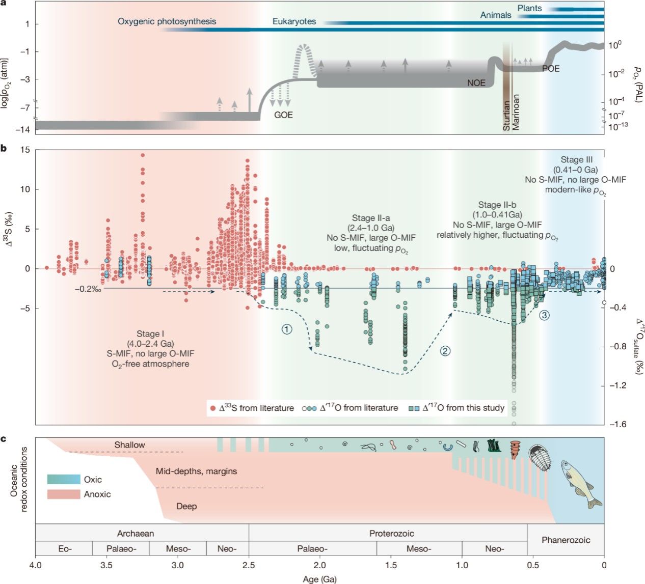 The International Isotope Effect Research Center of the School of Earth Sciences and Engineering, Nanjing University—led by Professors Yongbo Peng, Huiming Bao, and Xiaobin Cao—in collaboration with Professor Chao Li's team from Chengdu University of Technology and several other research institutes, has published a major study in the top journal Nature. By establishing a high-resolution triple oxygen isotope record of sulfate over the past ~2 billion years and combining it with quantitative biogeochemical modeling, the study reveals the stepwise evolutionary history of Earth's transition from an anoxic to an oxygen-rich atmosphere, as well as the mechanisms that controlled it. The findings provide critical geochemical tracers and theoretical foundations for understanding the origin and evolution of life on Earth and the formation of planetary habitability.