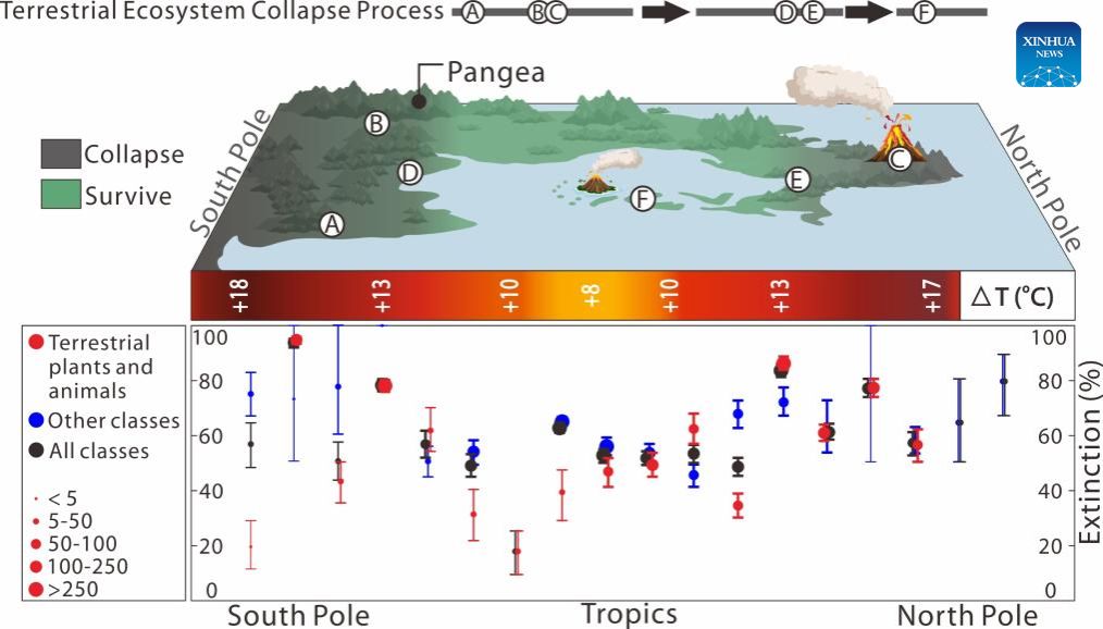 This image shows the pattern of terrestrial ecosystem collapse process at different latitudes at the end of the Permian period.(Xinhua News Agency)