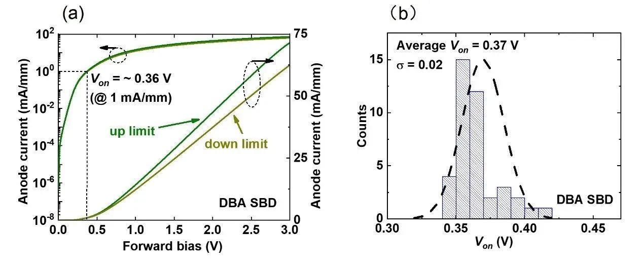 Fig. 2 | (a) Forward I-V characteristics of 40 DBA SBD devices, (b) Turn-on voltage distribution.
