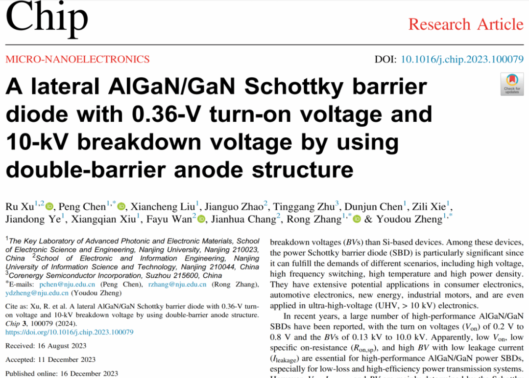 Recently, the team of Professor Chen Peng and Zhang Rong from School of Electronic Science and Engineering published a research paper, titled "A Lateral AlGaN/GaN Schottky barrier diode with 0.36 V turn-on voltage and 10 kV breakdown voltage by using double barrier anode structure," on the Journal Chip. The research achieved a lateral AlGaN/GaN Schottky barrier diode with a 0.36 V turn-on voltage and a 10 kV breakdown voltage by employing a double barrier anode structure. Dr. Xu Ru is the first author, and the corresponding authors are Prof. Chen Peng, Prof. Zhang Rong, and Prof. Zheng Youdou. (https://doi.org/10.1016/j.chip.2023.100079)