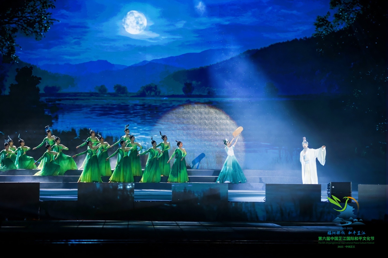 开幕式民族文艺演出以“福地怀化·和平芷江” 为主题,分为 “胜利之路”“文明长河”“民族欢歌”“和平之声”四个篇章,呈现出一场极具国际范、科技感且饱含厚重历史的视听盛宴。主题曲《和平》由新西兰流行乐男歌手Laurence(中文名:罗艺恒)与中国歌剧舞剧院青年女高音刘桐联袂演绎,将国风唱腔与现代流行曲风融合,搭配蕴含东方文化的歌词,传递和平的美好愿景。大型音诗画《砥柱湖湘》通过朗诵、影像与情境舞蹈,展现湖湘大地的精神力量;大型光影诗舞《屈原的树》以屈原与芷江杨溪云树的精神联结为线索,融合多种艺术元素,打造跨越时空的楚辞意境;音乐情景剧《飞虎·世界》还原了国际友人携手互助的真实往事;跨时空情景表演《芷江,向海而生!》则串联起芷江的发展历程。晚会的最后,伴随着焰火表演和《玉盘》《芷江飞来一支和平歌》《歌唱祖国》三首歌曲,现场氛围迎来高潮,“和平”的理念变得更为具象。