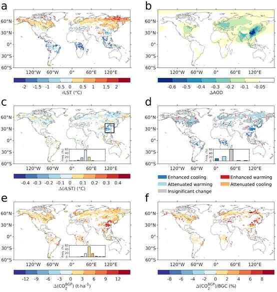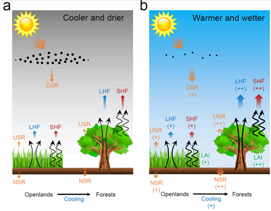 植树造林可以通过改变地表反照率、粗糙度和蒸腾效率影响陆-气之间的能量和水分交换,从而进一步影响局地温度。该效应在不同的纬度、季节、海拔以及全球变暖背景下表现不同。因此,植树造林的局地温度效应高度依赖于气候背景。除了上述影响气候背景的因素外,气溶胶也是区域气候变化的重要驱动因子。但是,减少气溶胶污染是否会改变植树造林的局地温度效应尚不清楚。