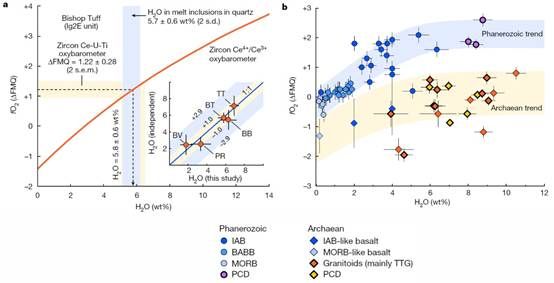 图1 (a)锆石氧逸度-湿度计的基本原理,以Bishop凝灰岩为例,插图中的线性关系显示该方法的准确性;(b)太古宙与显生宙岩浆氧逸度和水含量对比,其中红、黄、紫色为本文锆石氧逸度-湿度计结果