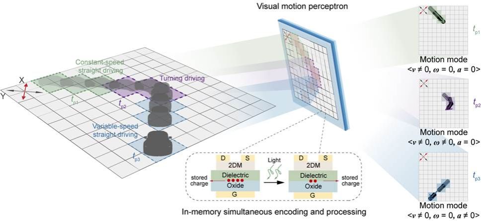 图1:视觉运动信息并行感知的示意图。行驶中车辆在不同时间段内(tp1,tp2与tp3)的运动模式可使用运动参数(v: 速度,ω: 角速度,a: 加速度)进行表示。在时间段tp1内,车辆进行匀速直线运动;在时间段tp2内,车辆进行具有一定的速度与角速度的转弯运动;在时间段tp3内,车辆进行加速直线运动。通过设计具有记忆功能的感知机,可实现对运动中所包含时空视觉信息的同步编码和计算。如虚线框内的物理过程所示,器件内存储电荷量的变化反应了入射光的时间变化。这种变化可被用来感知车辆在各个时间段内的运动信息。