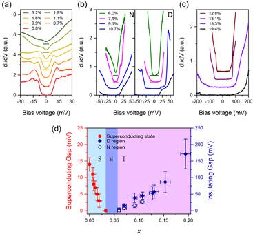 图3:扫描隧道显微谱演化过程和单层FeSe/STO的相图。(a)–(c) dI/dV谱随铁空位浓度的演化。(d) 单层FeSe/STO的铁空位浓度电子相图。
