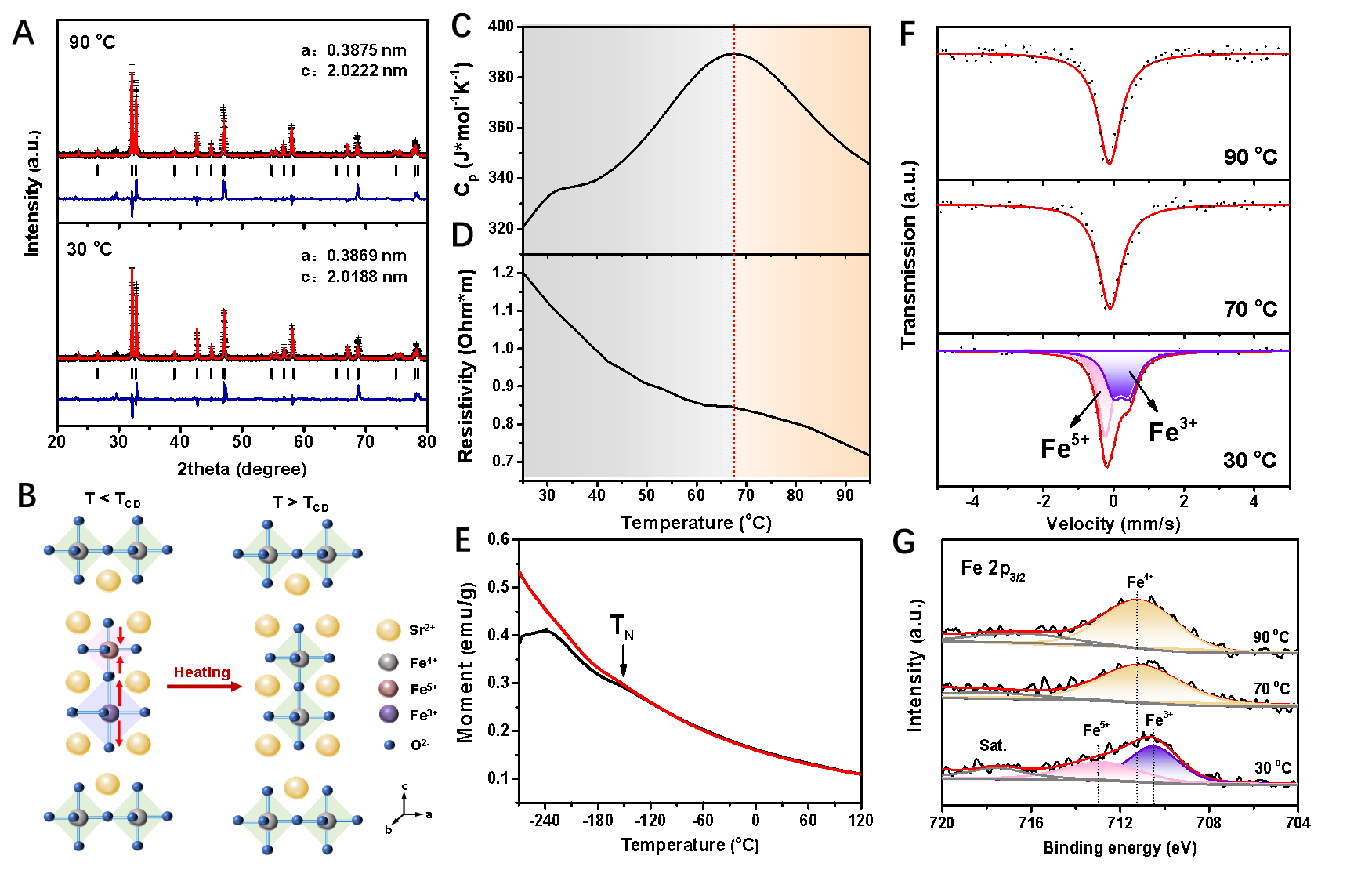 2.ASr3Fe2O73090 oC下的XRD Rietveld精修。(BSr3Fe2O7的四方晶体结构。T < TCD时,Fe4+发生CD并伴随着晶格的呼吸振动;T > TCDCD和晶格呼吸振动消失。(CSr3Fe2O7的比热容随温度的变化。热不连续性表明在TCD = 67 oC处存在二阶相变(虚线)。(D)温度依赖的电阻率。(ESr3Fe2O7的零场冷却(ZFC,黑线)和场冷却(FC,红线)磁化曲线。(F)顺磁Sr3Fe2O7307090 oC时的57Fe M?ssbauer谱及其拟合谱。(GSr3Fe2O7307090 oC时的原位Fe 2p XPS光谱。