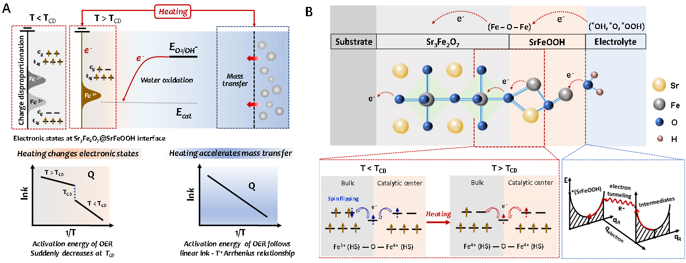 5.A)在氧化还原对介导的水氧化过程中,Fe基催化剂的电化学OER过电位来自催化层中高自旋Fe4+t2g3eg1)到催化剂体相内高自旋Fe3+t2g3eg2)的电子转移能垒。通过热耦合来抑制电荷歧化将为界面电子转移提供更多未占据的轨道。催化材料的电子态在没有热激励的情况下,热促进OER速率遵循线性的lnk - T-1 Arrhenius关系,即热扩散效应。但是,一旦在特定温度下触发材料热物理效应时,lnk - T-1的斜率发生变化,此时热可以调控催化剂的电子态,超越热扩散效应,显著提升OER性能。(BOER过程中的界面电子转移过程。OER中间体(*OH, *O, *OOH)与活性中心*SrFeOOH)在基本反应步骤中形成等能电子隧穿。qR是核坐标,qelectron是电子坐标。而在Sr3Fe2O7@SrFeOOH界面处的电子转移是通过Fe-O-Fe双交换作用在Fe4+t2g3eg1)的未占据eg轨道中实现的。
