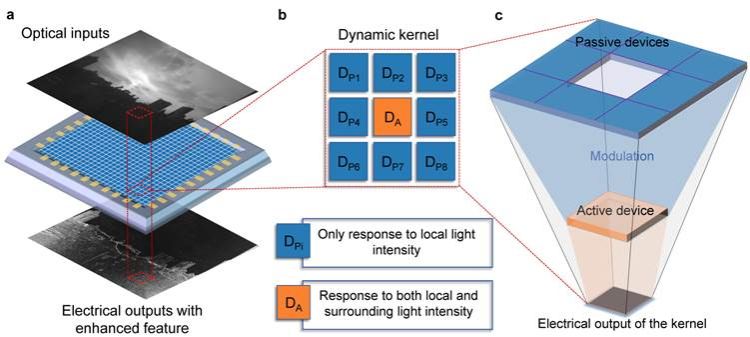 首先,研究团队在图像传感器内构建了局域像元关联计算单元(图1),展示了该计算单元如何实现对图像中低对比度信息关键特征的准确提取 (图1a)。该计算单元由1个动态像元和8个静态像元组合而成(图1b),其中,所有静态像元的光电响应度是固定且一致的,而动态像元的光电响应度会随着周围8个静态像元的光电流输出特性进行动态调控。该计算单元的总输出信号是所有像元的光电流总和(图1c)。基于局域像元之间动态信号交互与关联控制的新型感内计算范式,革新了传统图像传感阵列中每个像元彼此独立工作的静态传感模式,为传感器在复杂光学场景下的弱目标精准探测提供了新的技术途径。
