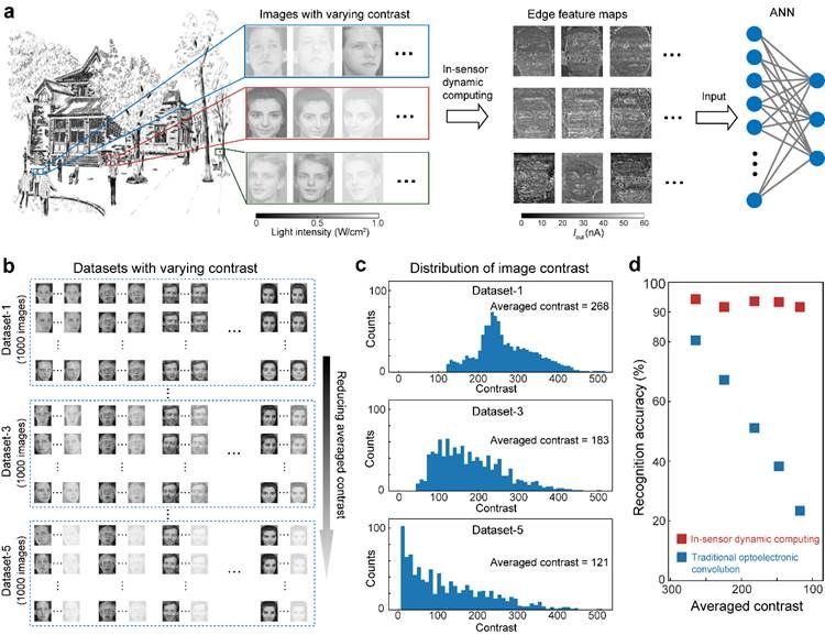 最后,研究团队将上述感内动态计算技术与单层人工神经网络(ANN)相结合,展示了该技术在复杂环境中弱目标的高精度、高鲁棒识别方面的应用潜力 (图5)。与传统卷积处理相比,感内动态计算技术能够更有效地放大弱目标的边缘轮廓特征。在后端神经网络算力相同的情况下,感内动态计算技术能在对比度恶化的条件下,依然稳健地实现较高的识别率,表明了感内动态计算技术在低对比度条件下弱目标的精准特征提取与高鲁棒识别的能力。该工作为智能机器视觉系统在复杂与极端光学场景中的应用提供了通用且可行的技术途径。