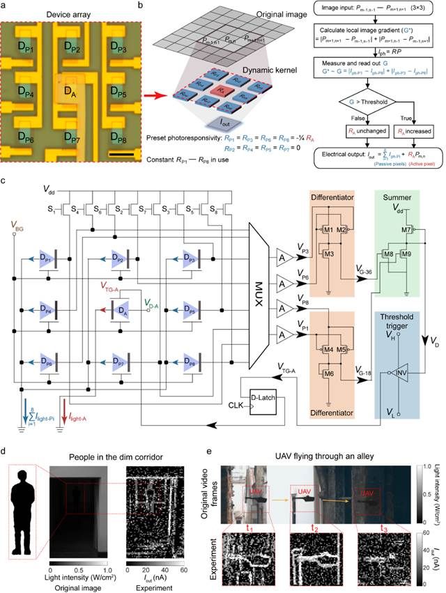 图4:二维局域关联感内计算的硬件及应用展示。(a) 石墨烯/锗异质结器件阵列的光学照片;(b) 由9个器件构成的动态感受野的操作逻辑流程图;(c) 动态感受野的电路结构示意图;(d-e) 两种典型场景下的弱目标特征提取实验结果,分别是昏暗走廊中站立的人与背景变化条件下的飞行无人机。