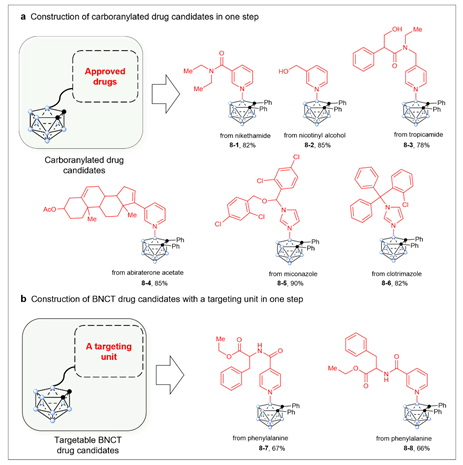 最后作者应用该策略,以高产率获得了巢式碳硼烷和不同药物分子之间的直接偶联,包括与吡啶-氨基酸模块化分子的偶联(图6)。通过这种方法,也可合成一系列BNCT候选药物分子。此外,作者还筛选了其中一些产物分子,并进行了抗肿瘤活性实验,结果显示出良好的生物活性。这些合成的碳硼烷基分子或许具有更好的药物活性和选择性,以及更低的毒副作用,有望筛选成为新型抗肿瘤药物,因此该研究为碳硼烷相关化合物的合成和药物研究提供了新的思路和方法。