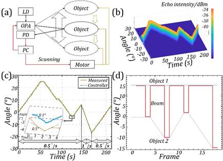 图3 面向移动用户的定位、跟随,以及快速光束切换:(a)实验架构;(b)移动物体的回波强度;(c)实际测量角度位置和控制角度位置对比;(d)两个移动物体之间的快速切换。