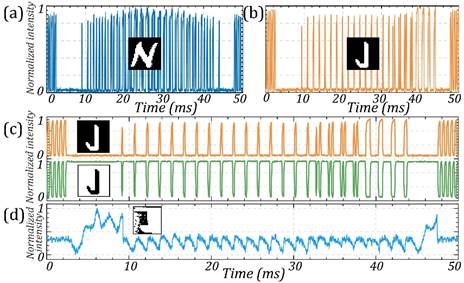 图2 基于切换的二值图案传输:(a)字母“N”;(b)字母“J”;(c)同时在两个接收器之间进行切换得到正“J”与反“J”。(d) 对照实验:无同步控制时传输”J”失败。