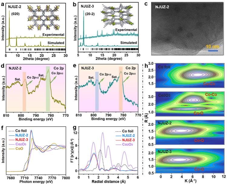 我们通过溶剂热反应过程合成了两种不同的多核钴团簇基配位聚合物,{[Co2(TCPPDA)(H2O)5]·(H2O)9(DMF)}和{Co1.5(TCPPDA)[(CH3)2NH2]·(H2O)6(DMF)2},分别表示为NJUZ-2和NJUZ-3 (图1)。如图2(a-b)所示,合成的钴基配位聚合物(CP)的PXRD图中的衍射峰显示了NJUZ-2的(020)晶面和NJUZ-3的(20-2)晶面的择优取向,展示了钴基CP的结构特征。高分辨率XPS光谱在781.5 eV和797.3 eV处的特征峰,分别对应于Co2+物种的2p3/2和2p1/2带(图2(d-e))。此外,可以在大约785.6 eV和801.7 eV处观察到卫星峰的存在。为了研究样品的局部配位和电子结构,我们测试了Co K边缘的X射线吸收精细结构(XAFS)数据。NJUZ-2和NJUZ-3样品的吸收边靠近CoO的位置,表明其氧化态相似(图2f)。此外,两条曲线中都没有明显的前边缘峰,这表明钴原子处于八面体配位环境。NJUZ-2和NJUZ-3的R空间图显示,在1.55?处有一个突出的峰值,这与Co-O配位的特征有关(图2g)。为了进一步阐明配位原子,采用了Co K边小波变换,表明样品的K位置与Co2O3接近,这也证明了Co-O配位的特征(图2h)。