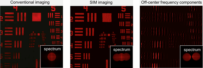 图2标准分辨率测试成像图。从左往右依次为无结构光图像、基于结构光照明重建的图像、仅包含高频信息的重建图像