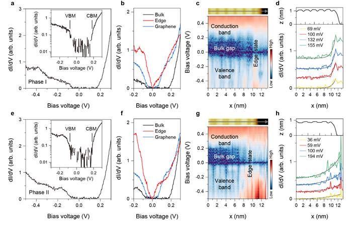 图3 单层ZrTe5的扫描隧道谱。(a, e) 分别为相1和相2远离边界的扫描隧道谱。(b, f) 分别为两种相边界上的扫描隧道谱。(c, g) 为沿垂直于边界的直线上的dI/dV谱。(d, h) 为两种相的边界态从边界向体内指数衰减。