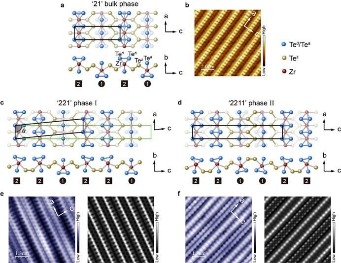 图2 单层ZrTe5的晶体结构。(a, b) 为单晶ZrTe5的结构图和原子分辨。(c, d) 分别为相1和相2的结构示意图。(e) 为相1的实验测量原子分辨和计算相同偏压原子分辨。(f) 为相2的实验测量原子分辨和计算相同偏压原子分辨。