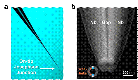 研究团队从无到有,历经五年时间成功研制出超导约瑟夫森探针显微镜系统。约瑟夫森探针是系统的核心部件,由两个并联的弱连接约瑟夫森结构成。研究人员采用带槽石英管拉制纳米探针,并结合磁控溅射薄膜沉积技术,在针尖尖端的弱连接处制备出两个并联的约瑟夫森结,得到了纳米级铌基约瑟夫森探针(图2),具有工作温度高、性能稳定、工艺可控等特点,拥有自主知识产权。