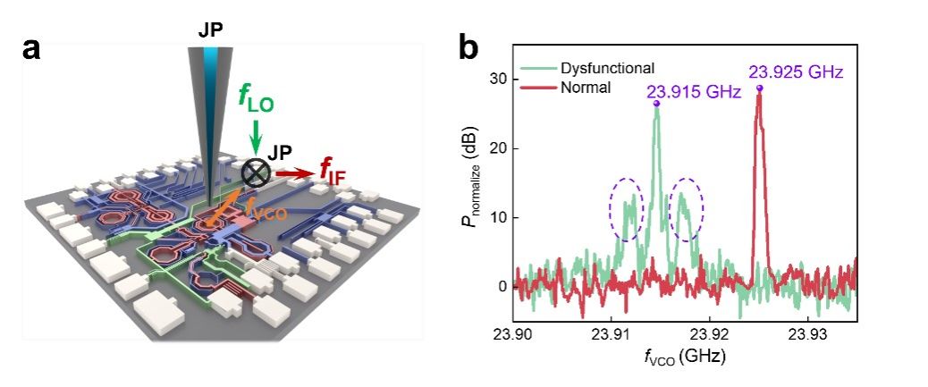 压控振荡器作为半导体产业的基本元件,在高频集成电路中的锁相环、时钟发生器和频率合成器等各种模块中有着诸多应用。集成电路芯片的常规分析手段通常是在其后端添加驱动电路,以及额外的接地-信号-接地焊盘或片上天线。这些额外电路和结构引入了不必要的复杂性,同时也缺乏空间分辨率能力,无法准确检测芯片上特定位置的工作状态。而超导约瑟夫森探针显微镜则为集成电路芯片的无损近场微波检测提供了一种可行的方案。