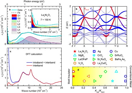 图1 (a) La3Ni2O7的光电导谱(T = 150 K)和Drude-Lorentz拟合结果,插图将低频的结果进行了放大。(b)和(c) 计算得到的La3Ni2O7的能带结构和光电导谱。(d) La3Ni2O7和一些其它典型材料的电子动能比Kexp/Kband
