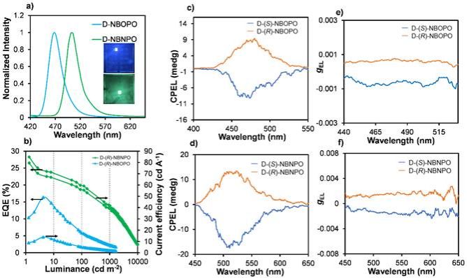 图2. (a) D-NBOPO和D-NBNPO器件的电致发光光谱. (b) D-(R)-NBOPO和 D-(R)-NBNPO器件的性能曲线. D-(R/S)-NBNPO和D-(R/S)-NBOPO器件的(c), (d) CPEL光谱, (e), (f) gEL – 波长曲线.