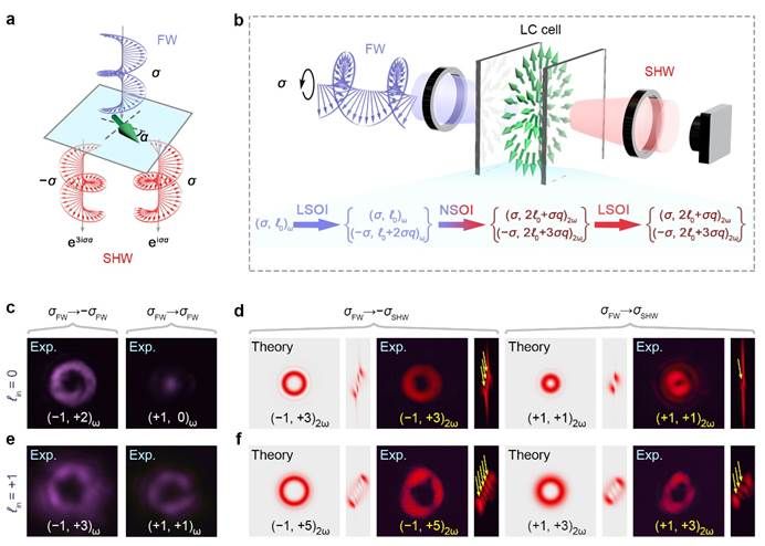 图3. 基于铁电向列相液晶q板的线性和非线性涡旋光束产生。(a) 自旋锁定的非线性几何相位操控。(b) 圆偏振飞秒激光泵浦下,非线性液晶q板中发生的级联式线性/非线性自旋-轨道角动量相互作用。(c,d) 圆偏振高斯光 (+1, 0)ω 泵浦下,线性和非线性几何相位编码的涡旋光束。(e,f) 高阶圆偏振高斯光 (+1, +1)ω 泵浦下,线性和非线性几何相位编码的涡旋光束。