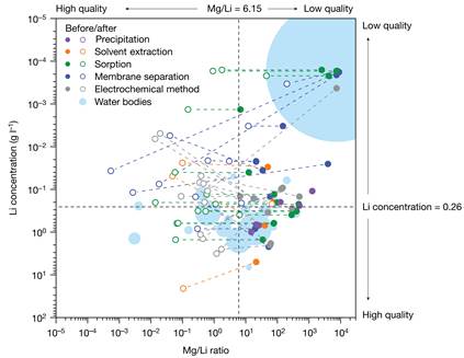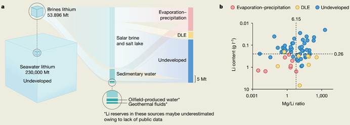 通过对全球主要水体锂资源开发情况的公开数据进行调研分析,该团队从水体开采程度和所用技术的角度提出了“低品质卤水”这一概念,即锂浓度低于0.26 g/l,或镁锂比(Mg/Li)高于6.15的卤水资源,通常包括海水、沉积水、地热流体、油田产出水和某些盐湖卤水等。这些卤水虽然锂含量较低,但其总储量巨大,并且在全球范围内分布广泛。因此,这些资源被认为是未来应对锂短缺、补充锂供给的潜在来源。