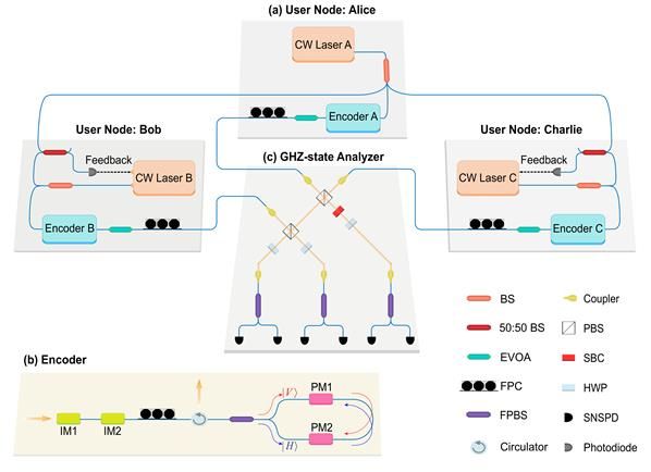 为了实现测量设备无关量子会议密钥分发协议,研究团队一方面在理论上将原始的三强度诱骗态协议改进为了四强度诱骗态协议。在发送脉冲数有限且符合计数率较低的情况下,新的四强度诱骗态协议的安全密钥率相较原协议有明显提升,同时通信距离也有显著增加。另一方面,研究团队在理论上研究并在实验上实现了弱相干光脉冲GHZ态投影测量中的多光子干涉现象。研究团队搭建了三用户通信网络,并最终分别在系统整体损耗约为14.1dB,17.8dB和21.5dB的情况下获得了约7.54bps,1.17bps和0.097bps的会议密钥率。近期,南方科技大学团队完成了相关工作(Phys. Rev. Lett. 133, 210803),与本工作一起推进实用化、多用户量子网络的发展。