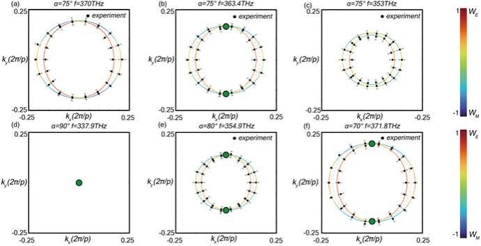 研究团队从实验上测量了拓扑简并点附近的两个色散能带的等频率线,并与理论结果进行了比较。在实验上通过对反射谷的提取给出了等频率点,黑点为实验测量值,实线是理论计算结果。图3(a-c)分别给出了扭转角为75°样品等频率线高于简并点(a),位于简并点(b),低于简并点(c)处的等频率线,其颜色由界面态电场和磁场能量的比重决定(见图例)。具体的分析指出,在简并点附近,两种模式的主导分量不同(分别是Ez和Hz和),表现为等频率线的颜色不同。图3(d-e)给出了三个不同扭转角样品拓扑简并频率处的等频率线,分别是(d)α=90°;(e)α=80°;(f)α=70°。此结构简并点处的等频率线和两界面本征模式主导分量的区别都类似于三维空间中各向异性介质,因此,以上结果显示,此类扭转结构可以被认为是一种可调的二维各向异性双折射材料。