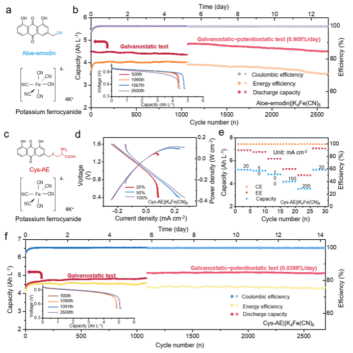作者首先采用“点击化学”策略将半胱氨酸引入到大黄素骨架上,得到带有氨基、羧基以及羟基等多个极性基团的 Cys-AE 分子。相较于原始的大黄素(AE),Cys-AE 展现出更高的水溶性(可达0.76 M)和更优的电化学可逆性。在循环伏安测试中,Cys-AE 表现出稳定的氧化还原峰,且在多轮扫描中峰形保持良好,表明其具有优异的循环稳定性。