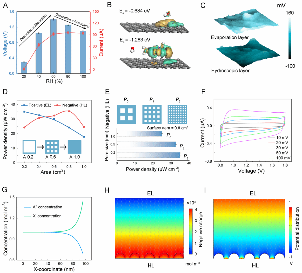 图3. A. 3D-SMEG在不同相对湿度下的性能;B. 3D-SMEG表面与水分子的电荷密度差及吸附能;C. KPFM的表面电势分布;D. 电极调整与3D-SMEG接触面积的功率密度变化;E. 调整吸湿侧电极孔径的功率密度变化;F. 扫描速率为10-100 mV s-1 时CV 曲线;G-I. 3D-SMEG中COMSOL多物理场模拟。