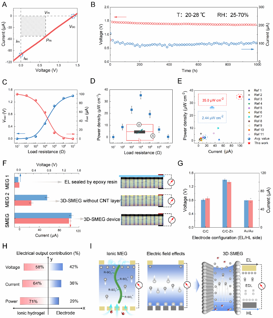 图2. A. 3D-SMEG的I-V曲线;B. 3D-SMEG在连续1000小时测试的Voc和Isc。C-D. 在不同电阻下的电压,电流和功率密度值;E. 和已报道MEG进行性能对比;F. 不同装置在相对湿度为60%时的电输出;G. 采用不同负极3D-SMEG的电输出;H. 电输出性能的贡献率;I. 3D-SMEG的工作机理示意图。