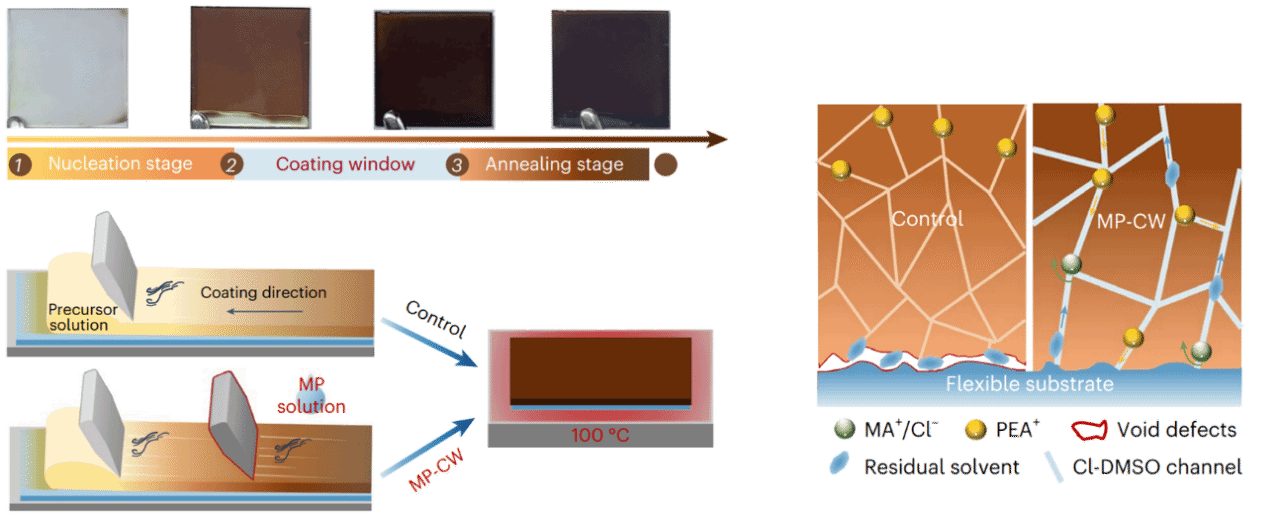 此次研发合作中,凯发k8官网团队创新性地开发了“原位添加剂涂层策略”,在连续气体淬火条件下,向湿润的钙钛矿薄膜动态引入添加剂,精准调控结晶过程。“柔性模组的制备就像在粗糙的帆布上作画,溶剂挥发时极易形成裂纹和孔洞,而我们的研究则像是为了对薄膜进行‘修复术’”论文第一作者李曼亚比喻道,“通过离子通道可以精准的输送添加剂到缺陷处,尽可能地提升柔性基板上的薄膜质量。”