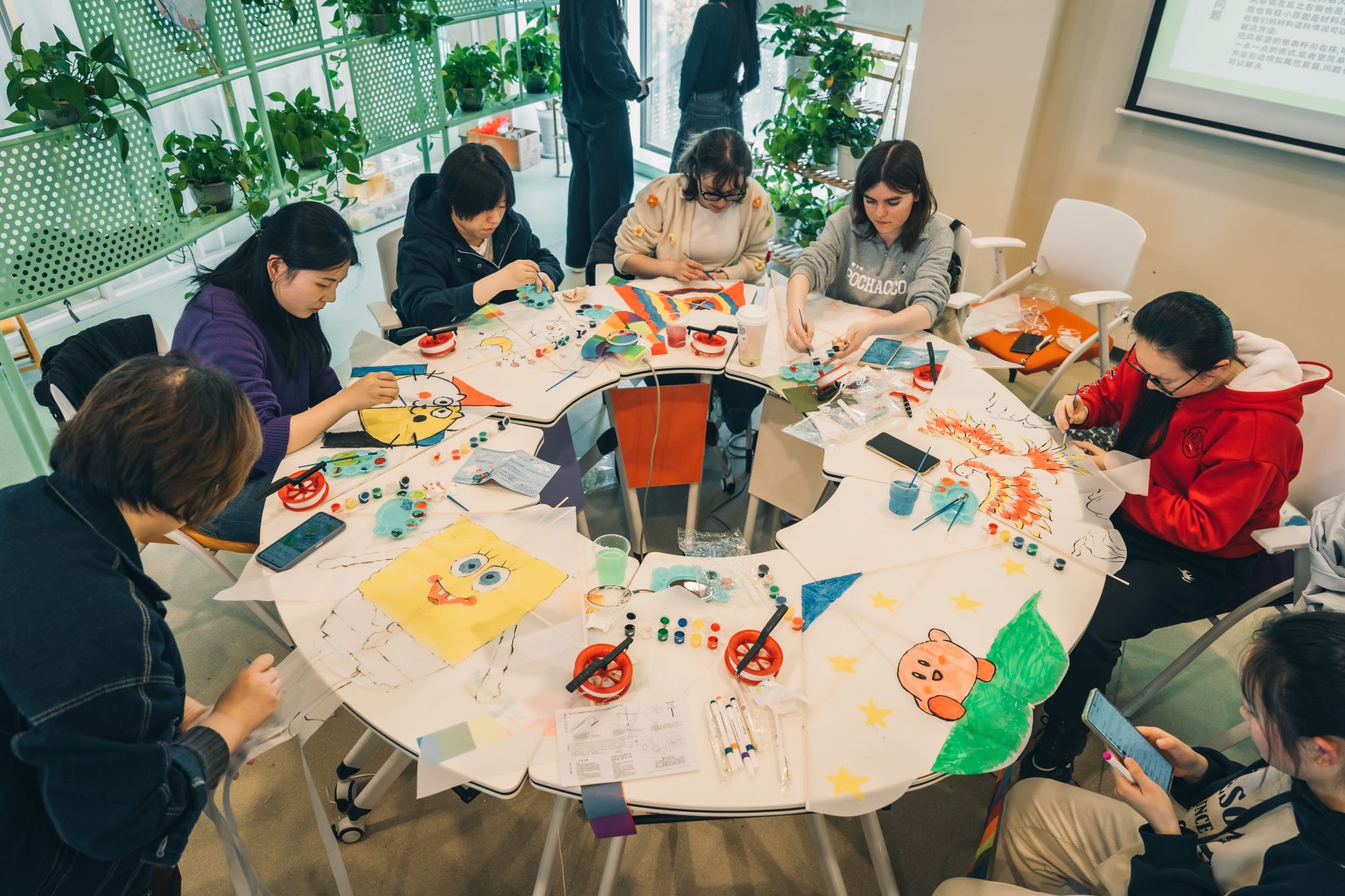 在制作纸鸢的过程中,来自世界各地的同学们也自然地跨越了语言和文化的屏障,彼此帮助、相互了解。当有同学遇到制作的困难时,旁边的同学会主动伸出援手;开始绘制风筝图案时,大家一边绘画,一边相互介绍自己的创作初衷,也毫不吝啬向对方的作品给予肯定与赞美,活动现场不时洋溢着欢声笑语。
