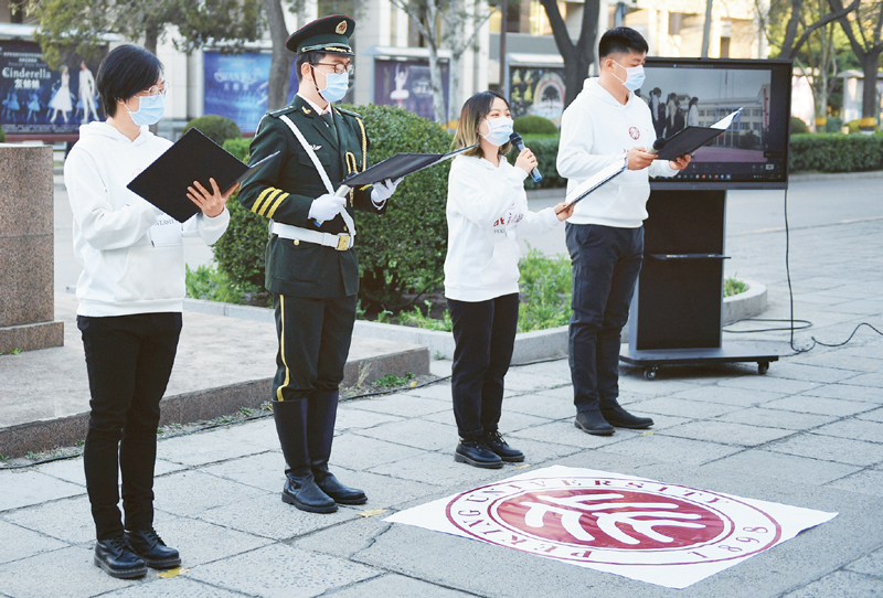 2020年3月23日,北京大学的师生在“让青春在党和人民最需要的地方绽放绚丽之花”为主题的升旗仪式上进行诗朗诵。 新华社记者 张晨霖/摄